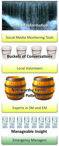 Social Media volunteers can provide that extra human interpretation that is so valuable to emergency managers. They can discern the difference between a vocal minority and the genuine swell of a crisis. They can sift through retweets and outliers to find those true gems of information. They can formulate the true patterns and trends in the data. I believe crisis volunteers who are experts in social media are the missing intermediaries between unrestrained, crowdsourced sound bites and well curated information that can contribute to a situation report.